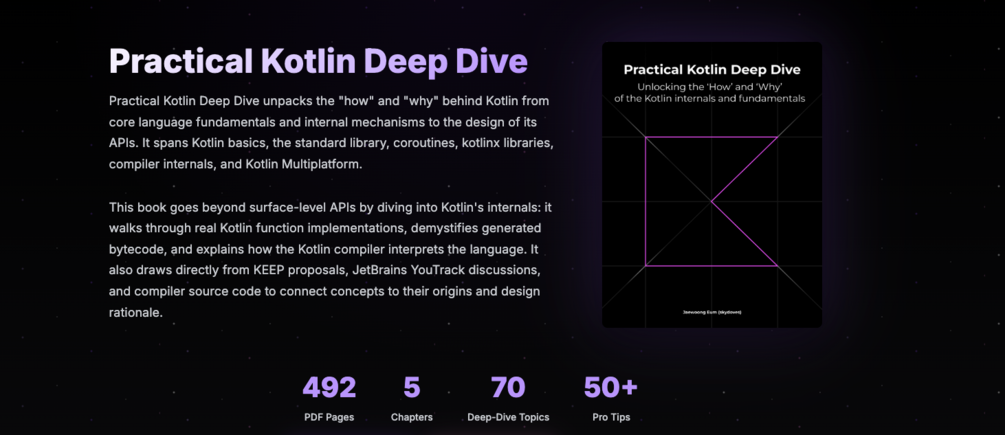 Each chapter builds on the last, moving from language basics through the standard library, into coroutines and kotlinx ecosystem, then into compiler internals and cross-platform development. By the end, you'll understand both practical usage and the reasoning behind Kotlin's design choices.